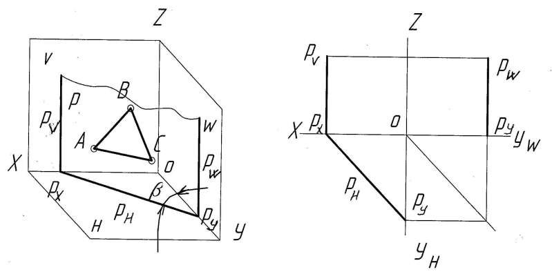 Любой элемент, лежащий в этой плоскости, проецируется на плоскость Н в прямую линию (на горизонтальный след плоскости). В качестве примера на рисунке 3.5 горизонтально проецирующая плоскость Р задана плоской фигурой – треугольником АВС. Из чертежа видно, что все элементы данной плоскости проецируются на плоскость Н в прямую линию Рн, называемую горизонтальным следом плоскости. Фронтали этой плоскости являются горизонтально проецирующими прямыми. Угол наклона горизонтально проецирующей плоскости Р к плоскости V на комплексном чертеже определяется как угол β, заключенный между горизонтальным следом Рн данной плоскости и прямой, перпендикулярной линиям связи.