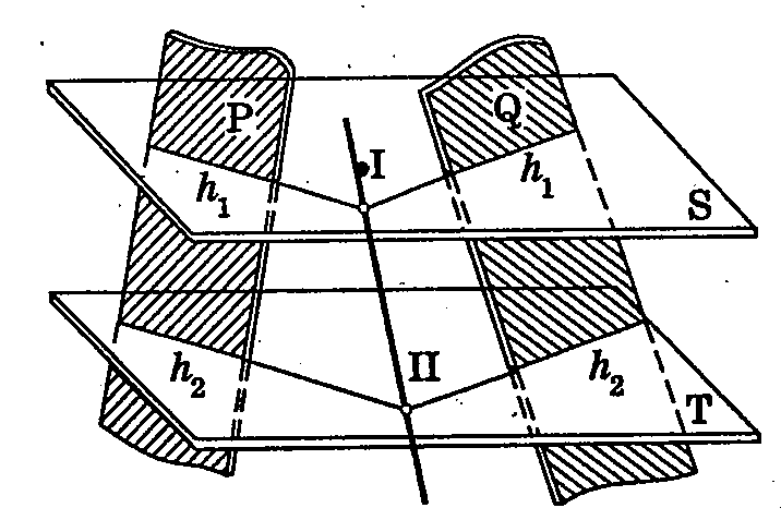 Пересечение двух плоскостей общего положения заданных плоскими фигурами На рисунках 3.21, 3.22 приведен основной прием решения задач с помощью вспомогательных плоскостей (S и T).