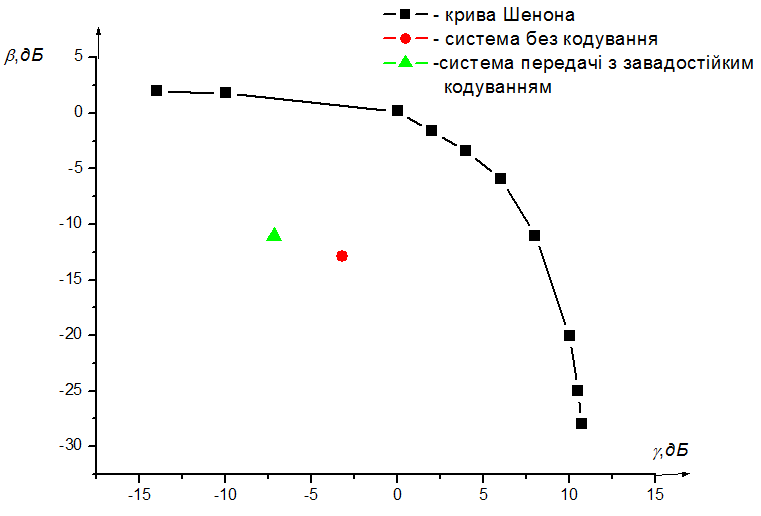 Рис.6.1. Графік залежності енергетичної і частотної ефективності З рис 6.1 видно, що в системах з ЧМ при збільшенні числа позицій М енергетична ефективність b збільшується, а частотна ефективність g- зменшується. Також видно, що ефективність реальних систем істотно нище границі Шеннона. Характер обміну між
