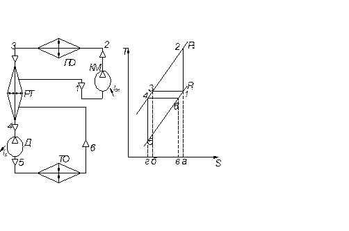 Работа такой газовой холодильной машины отличается тем, что после промежуточного охладителя предварительно охлажденный газ состояния 3 направляется в регенеративный теплообменник, в котором еще больше охлаждается в процессе 3-4 за счет теплообмена с холодным обратным потоком, идущим из теплообменного аппарата. В тоже время обратный холодный поток в регенеративном теплообменнике нагревается в процессе 6-1 за счет теплообмена с прямым теплым потоком. Удельная холодопроизводительность цикла: qо = Пл. г56вг = h6 – h5 = ср(Т6 – Т5) Удельная теплота, отведенная от хладагента в промежуточном охладителе: q = Пл. б32аб = h2 – h3 = ср(Т2 – Т3) Работа цикла: lц = q – qo = Пл. б32аб – Пл. г56вг = (h2 – h3) – (h6 – h5) или lц = ср(Т2 – Т3) – ср(Т6 – Т5) Работу цикла так же можно найти из теплового баланса холодильной машины, который имеет вид: qo + qрт.п. + lс = q + qрт.от. + lр где qрт.от - удельная теплота, отведенная от теплого прямого потока в регенеративном теплообменнике, qрт.от. = (h3 - h4), Дж/кг; qрт.п. – теплота, подвенная к холодному потоку в регенеративном теплообменнике, qрт.п. = (h1 – h6). lц = q + qрт.от. - qo - qт.п. = (h2 – h3) + (h3 - h4) – (h6 – h5) – (h1 – h6) = = (h2 – h1) – (h4 – h5) В цикле 1234561 (h2 – h1) = lс - удельная работа, затраченная на сжатие хладагента в компрессоре в процессе 1 - 2, (h4 – h5), = lр – полезная работа, полученная при расширении газа в детандере в процессе 4 - 5. Тогда: lц = lс - lр Холодильный коэффициент цикла: