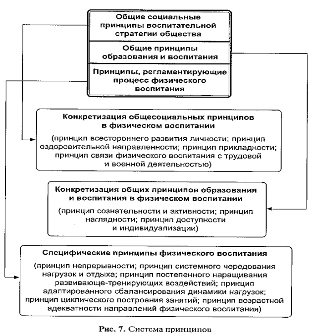 Общеметодические принципы - это отправные положения, определяющие общую методику процесса физического воспитания. Систематическое воздействие физическими упражнениями на организм и психику человека может быть успешным в том случае, когда методика применения физических упражнений согласуется с закономерностями этих воздействий. Они отражают основные и общие положения, а также рекомендации, сделанные из сопоставления данных ряда наук, изучающих разные стороны процесса физического воспитания. Рассматривая общеметодические принципы, мы раскрываем основные закономерности физического воспитания и выясняем методические положения, вытекающие из них. Принцип сознательности и активности Реализация рассматриваемого принципа должна приводить к обогащению занимающихся знаниями, глубокому пониманию техники различных упражнений, воспитанию сознательного и активного отношения к процессу физического воспитания. Сознательность - это способность человека правильно разбираться в объективных закономерностях, понимать их и в соответствии с ними осуществлять свою деятельность. Основой сознательности являются предвидение результатов своей деятельности и постановка реальных задач. Сознательность придает обучению воспитывающий характер и в значительной мере способствует формированию высоких морально-психологических и профессиональных качеств личности. В процессе физического воспитания прежде всего должно быть обеспечено сознательное отношение к занятиям физическими упражнениями в целом. Тогда у занимающихся будут созданы достаточно сильные и устойчивые стимулы, побуждающие их годами уделять время для занятий и мобилизовать для них свою энергию. От преподавателя физического воспитания и тренера по виду спорта во многом зависит создание веских мотивов и высоких целей, стимулирующих устойчивый и здоровый интерес его воспитанников к избранному ими направлению или виду физического воспитания в целом.