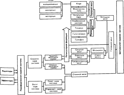Нервная система-центр деятельности всего организма. Это обусловлено тем влиянием, которое она одновременно оказывает и на взаимодействие организма с внешней средой, и на такие его внутренние процессы, как, например, кровообращение или пищеварение (схема A.I). Таким образом, нервная система выполняет две важнейшие функции. Первая из этих функций-коммуникационная. С одной стороны, это передача различным нервным центрам информации, получаемой рецепторами, находящимися в коже, глазах, ушах, носу, рту и других органах; с другой стороны, это проведение сигналов от нервных центров к зффекторам (железам и мышцам), что дает возможность адекватным и специфическим образом реагировать на те события во внешней среде, с которыми сталкивается организм. Эту двоякую функцию обеспечивает периферическая нервная система, состоящая, во-первых, из соматической системы, ответственной за взаимодействия организма с внешним миром, и, во-вторых, из вегетативной системы, регулирующей деятельность таких внутренних органов, как сердце, легкие, пищеварительный тракт, почки и т.д., и таким образом координирующей «вегетативную жизнь» организма.