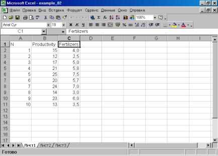 1. В Excel исходные данные должны быть организованы таким образом, чтобы в каждой колонке были представлены данные по соответствующей переменной (рис. 21). Имена переменных набираются латинскими буквами. Файл необходимо сохранить в формате Excel 5.0/95 (рис. 22). Введем обозначения: урожайность зерновых – переменная Productivity (зависимая, Y); внесено удобрений на 1 га посевов – Fertilizers (независимая, X).