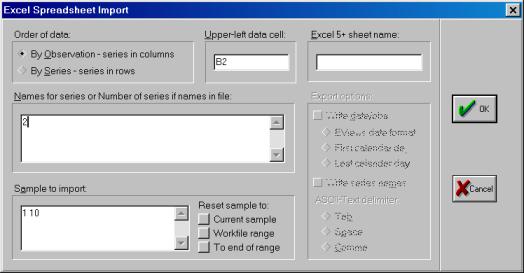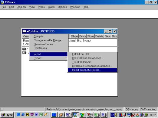Рис. 22. 2. Создаем рабочий файл для импортирования исходных данных из Excel в Eviews, работая с диалоговым окном File/New/Workfile (рис. 23), далее выбираем: Procs/Import/Read Text-Lotus-Excel (рис. 24).