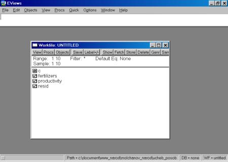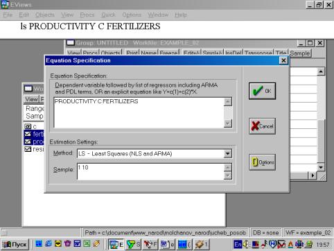 Рис. 36. 7. В диалоговом окне описать в общем виде искомое уравнение: LS PRODUCTIVITY C FERTILIZERS <Enter> (метод наименьших квадратов (LS) эндогенная переменная, константа, экзогенная переменная), или выбрать в строке главного меню EVIEWS: QUICK/ESTIMATE EQUATION/ PRODUCTIVITY C FERTILIZERS (рис. 37). В открывшемся окне (рис. 38) должны быть переменные: зависимая переменная, применяемый метод, число наблюдений, параметры уравнения регрессии, стандартные ошибки, значения t – статистик и соответствующие им вероятности, значение