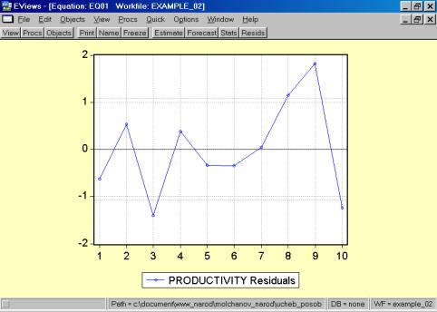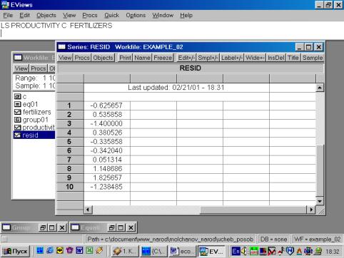 Рис. 44. 11. Данная операция возможна только в том случае, если ей предшествует построение регрессионного уравнения. В окне Workfile можно дважды щелкнуть на переменной Resid (рис. 45). Далее, выбрать: VIEW/LINE GRAPH/, или, открыв окно с параметрами уравнения регрессии, выбрать: VIEW /ACTUAL, FITTED…/ACTUAL, FITTED…TABLE/ (рис. 46). Результат представлен на рис. 47. Другой вариант вывода (фактические, предсказанные значения переменных, остатки, график остатков) – рис. 48.