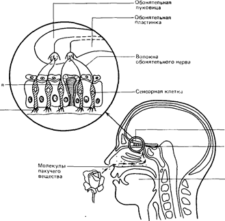 Для большинства низших животных обоняние-самое важное из чувств. Кроме того, это единственный вид ощущений, обусловленный прямой передачей информации в кору, минуя промежуточные низшие центры головного мозга. В каждой половине носовой полости, в ее верхней части, насчитывается около 30 млн. рецепторных клеток, ответственных за распознавание присутствующих в воздухе пахучих веществ (рис. А.7), Между тем до сих пор мало что известно о том, как происходит такое распознавание. Теоретически различают семь основных групп запахов. Запах может быть эфирным (ацетон), камфорным (нафталин), мускусным (мускус), цветочным (запах розы), ментоловым (мята), острым (уксус) или гнилостным (запах тухлого яйца). Чтобы объяснить, каким образом мозг распознает запахи, было выдвинуто предположение, что каждая клетка функционирует как замок, к которому подходит только один ключ, соответствующий специфическому типу молекул определенной формы и величины. Позже, однако, было показано, что иногда молекулы со сходной структурой вызывают разные обонятельные ощущения. Обоняние играет важную роль в оценке потребляемой пищи. Когда нос «забит» (например, при насморке), пища кажется совсем безвкусной. Мы не способны хорошо оценивать качество и вкус пищи только в результате ее пережевывания и проглатывания - мы всегда пропускаем воздух через полость носа, где расположены обонятельные клетки. Биологические основы поведения 227
