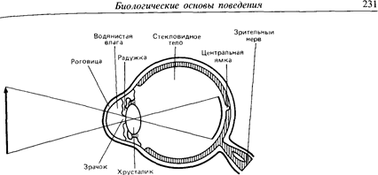 Рис. А. 11. Глаз можно уподобить фотоаппарату, объектив которого соответствует хрусталику, диафрагма-радужной оболочке, а фотопленка-сетчатке. во, выполняющее примерно те же функции, что и водянистая влага), формируют на сетчатке глаза четкое изображение. Рецепторами в сетчатке служат клетки, содержащие чувствительные к свету вещества - фотопигменты, разлагающиеся под действием фотонов и запускающие тем самым электрическую реакцию рецепторов. По периферии сетчатки распределены 120 млн. палочек, не способных различать цвета. Зрение в черных, серых и белых тонах не требует много света-палочки весьма эффективно функционируют и при слабом освещении. Цветовое зрение обеспечивают 6-7 млн. колбочек, сосредоточенных в центральной области сетчатки, особенно в небольшой, с булавочную головку зоне, где около 50 тысяч колбочек образуют так называемую центральную ямку. Каждая колбочка содержит фотопигмент одного из трех типов, чем и определяется ее чувствительность к световым волнам той или иной длины-к красному, зеленому или синему цвету; соответствующий дополнительный цвет подавляет реакцию колбочки1. Колбочки и палочки образуют целую сеть связей с двумя другими слоями клеток, расположенными впереди слоя рецепторов, - сначала с биполярными клетками, а затем с ганглиозны.ми клетками, которые посылают свои нервные волокна в составе зрительного нерва в головной мозг. Таким образом, световые волны, прежде чем воздействовать на ' Об этом и о том, как формируются отрицательные последовательные образы, см. в документе 8.2. 232 Приложение А