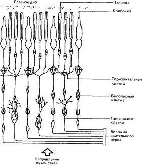 Рис. А. 12. Проникающие в сетчатку световые волны, прежде чем вызвать возбуждение палочек и колбочек на самом дне глаза, проходят через три слоя нервных элементов. Возникающие в результате нервные сигналы проводятся по путям, образуемым сначала биполярными, а затем ганглиозными клетками, и передаются потом в головной мозг по волокнам зрительного нерва. фоторецепторы (колбочки или палочки) и породить нервные сигналы в биполярных и ганглиозных клетках, вначале должны пройти сквозь два слоя этих самых клеток (рис. А. 12). Ганглиозных клеток насчитывается около миллиона, т. е. на 130 рецепторных клеток в среднем приходится одна ганглиозная клетка. Однако «концентрация» проводящих путей различна в зависимости от того, идет ли речь о палочках или о колбочках. Информация от палочек передается по «общим» нервным путям, где одна ганглиозная клетка приходится на многие десятки палочек; что касается колбочек, то многие из них располагают «собственным», индивидуальным выходом в зрительный нерв и головной мозг. Такой характер передачи информации. наряду с тем фактом, что колбочки более плотно сконцентрированы в центральной ямке. позволяет понять, почему острота зрения максимальна именно в этой области сетчатки и почему предмет, изображение которого проецируется в центр сетчатки, всегда воспринимается отчетливее, чем предмет, расположенный ближе к периферии поля зрения. Психологические аспекты восприятия цвета. Как видно из всего Биологические основы поведения