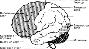 Кора представляет собой слой серого вещества толщиной в среднем 3 мм. В кору приходят сенсорные волокна после «переключения» в таламусе, и из нее выходят моторные волокна, направляющиеся в спинной мозг. Два мозговых полушария соединены между собой комиссурами-поперечными пучками нервных волокон. Главной из этих комиссур является толстая пластина мозолистого тела; она простирается спереди назад на 8 см и состоит более чем из 200 млн. нервных волокон, идущих из одного полушария в другое. Кора каждого полушария образует шесть обособленных долей, разграниченных бороздами, из которых две особенно крупные - роландова и сильвиева. В передней части мозга выделяют лобную долю, в верхней-теменную, в боковой-височную, в задней-затылочную; под височной долей, в глубине сильвиевой борозды находится долька, называемая островком, а под мозолистым телом, на внутренней поверхности полушария-доля мозолистого тела (рис. А.24). Между бороздами коры образуются валики, называемые извилинами, которые в большей или меньшей степени соответствуют областям с определенными функциями. Это могут быть сенсорные, моторные или ассоциативные зоны коры (см. рис. А. 19). Сенсорные зоны получают информацию от различных рецепторов, а моторные зоны посылают команды, управляющие движениями. Таким образом, сенсорные области мозговой коры представляют собой конечные пункты на пути волокон, связанных с периферической нервной системой, и их разрушение приводит к потере чувствительности в той области тела, где расположены соответствующие рецепторы. Моторные области дают начало волокнам, разрушение которых вызывает паралич конечности, управляемой нейронами соответствующей области коры. ' К базальным ганглиям причисляют и другие, более мелкие ядра, расположенные в мозговом стволе (такие, например, как черная субстанция, красное ядро, голубое пятно и др.). 254 Приложение А