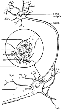 Рис. A.30. Синаптическое соединение нейронов (в середине - область синапса при большем увеличении). Терминальная бляшка пресинаптического нейрона содержит пузырьки с запасом нейромедиатора и митохондрии, доставляющие энергию. необходимую для передачи нервного сигнала. 1 Это значит, что если за одну секунду отсчитывать по 1000 синапсов, то для их полного пересчета потребуется от 3 до 30 тысяч лет (Changeux, 1983, р. 75). Биологические основы поведения