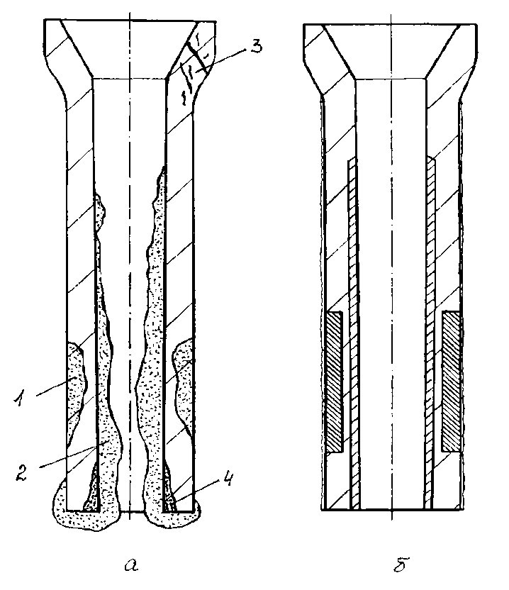 Основной причиной выхода погружных стаканов из эксплуатации является эрозионный износ в зоне шлакового пояса (1), зарастание внутренней полости в зоне выходного отверстия (2) и растрескивание верхней части изделия (3), связанное с подсосом воздуха в стык между стаканом-дозатором и погружным стаканом (рис. 1.2а), и образование продольных сквозных трещин при термоударе (недостаточном подогреве стакана перед разливкой). Наиболее высокую эксплуатационную стойкость обеспечивают корундографитовые погружные стаканы, усиленные специальным цирконовым поясом в зоне контакта со шлакообразующей смесью (рис. 1.2б).
