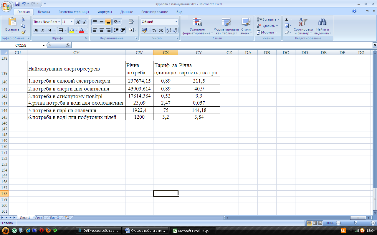 Qпар= 6.потреба в воді для побутових цілей Qвод.=Нввод.*∑Чроб., м3 [4.24] Нввод. – норматив витрат води для побутових цілей на 1 робітника (24 м3 в рік/1 роб.) ∑Ч роб – наявна чисельність основних і допоміжних робітників (50 чол.) Qвод.=24*50=1200 (м3) Визначення планової вартості енергоресурсів проводимо а таблиці. Планова вартість енергоресурсів Таблиця 4.8