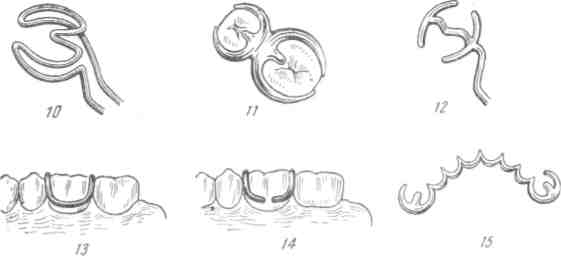 Рис. Различные виды удерживающих и опорно-удерживающих кламмеров. 9 — спорно-удерживающий литой кламмер; 10 — опорно-удерживаю-щий проволочный кламмер; // — кламмер Бонвиля; 12 — кламмер Рейхель-мана; 13, /4 — перекидные кламмеры; /5 — непрерывный кламмер, соединенный на концах с опорно-удерживающими.