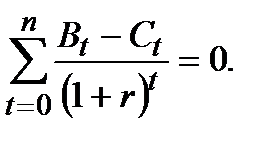 Соотношение (6) является основным для определения экономической эффективности проекта с учетом экологической составляющей и фактора времени. В том случае, если чистая современная стоимость в (6) больше нуля, проект экономически эффективен. Для определения приемлемости проекта часто используются и два других критерия: внутренней ставки рентабельности (IRR) и соотношения выгоды/затраты (BCR). Величина внутренней ставки рентабельности эквивалентна дисконтной ставке (r), при которой текущее значение выгод будет равно величине затрат (формула 7):