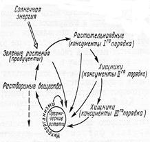 Главный источник круговорота - солнечная энергия, порождающая фотосинтез. Эта энергия неравномерно распределяется по поверхности Земли. Так, на экваторе на единицу площади тепла приходится в три раза больше, чем на полюсах. Большая часть солнечной энергии теряется в результате отражения, поглощения почвой, транспирации, на фотосинтез тратится не более 5% от всей энергии, но чаще - не более 2-3%. Биогеохимический круговорот веществ в биосфере представляет собой обмен микро- и макроэлементов и простых неорганических веществ (СО2, Н2О) с веществом атмосферы, литосферы и гидросферы. Круговорот отдельных веществ В.И. Вернадский назвал биогеохимическим циклом. Суть цикла заключается в том, что химические элементы, поглощенные организмом впоследствии покидают его, уходя в абиотическую среду, затем через какое-то время снова попадает в живой организм. Этими циклами и круговоротом обеспечивается важнейшие функции живого вещества в биосфере. В.И.Вернадский выделял пять функции живого вещества биосферы: газовой, концентрационной, окислительно-восстановительной, биохимической (размножение, рост и перемещение в пространстве) и биогеохимической деятельности человека (охватывает все возрастающее количество веществ земной коры, в том числе таких концентратов углерода, как уголь, нефть, газ). В биогеохимическом круговороте веществ важна роль углерода, кислорода, азота, фосфора, серы, из которых состоит белковая молекула организмов. В круговороте углерода, наиболее подвижной его формы СО2, четко прослеживается трофическая цепь (рис. 25): продуценты улавливают углерод из атмосферы при фотосинтезе; консументы поглощают углерод с телами продуцентов и консументов низших порядков; редуценты возвращают углерод вновь в круговорот. Скорость круговорота СО2 составляет 300 лет.
