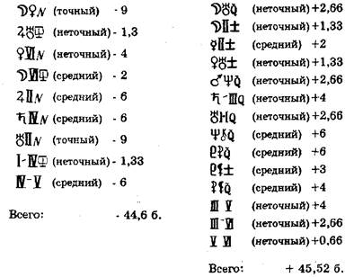Затем для каждой планеты подсчитываем общий кармический балл. 1. Если общий балл со знаком «минус», то это дает ущербность, комплекс. 2. Если суммарный балл положителен, то это достоинство. 3. Если планета по 12 пунктам набирает только положительный или только отрицательный балл, то она имеет абсолютный кармический статус. 4. Кармический статус +7 или -7 называется королевским. Планета, имеющая положительный королевский статус, неуязвима. Космограммы с королевским статусом встречаются редко, еще реже - космограммы с абсолютным королевским статусом. Абсолютный королевский статус - это блеск, он устойчив и выражен. Если планета имеет королевский статус -7, то это подчеркнутый выраженный комплекс. Королевский статус +7 и больше говорит о большом накопленном потенциале. Чтобы вычислить кармический статус каждой планеты, заполняем таблицу. Обращаемся к нашей исходной космограмме (стр.269).