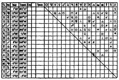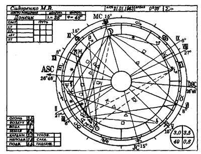1. Прежде всего оцениваем карту в целом. Обращаем внимание на заполненные знаки, дома, пустые зоны. Мы видим, что карта акцентирует внимание более всего на знаках Стрельца и Козерога и соответственно на I и III домах. Над проблемами этих знаков и домов человеку придется работать в настоящей жизни. 1-й дом - программа развития личности в данном воплощении. Он представлен знаками Скорпиона и Стрельца. Человеку предстоит в течение жизни избавиться от подозрительности и критичности Скорпиона, депрессий, черного юмора. Стрелец – это огонь высшей устремленности, он жизнерадостен и оптимистичен. Прорабатывать нужно излишний и ложный энтузиазм, поверхностность. Программа III дома - обучение. Интеллектуальный уровень в этой и прошлой жизни. Это самый «насыщенный» знак и дом. Человек будет иметь очень широкий круг общения и сам склонен к контактам. Дефицит общения в данной ситуации вызывает даже страдания. Скорее всего, у него будут сложности с единомышленниками и интимными друзьями (II и VIII дома слабые). Знак Козерога дает человеку практичность в общении с людьми. Гармоничные аспекты к дому обещают хорошие административные способности и уважение. Этому человеку люди будут подчиняться. В обучении большая целеустремленность. Будут и сложности. Но в конечном счете практический успех. Карту держит конфигурация «Большой тригон», которая связывает III-VI и X дома. Это проблемы, которые уже проработаны в прошлых жизнях.