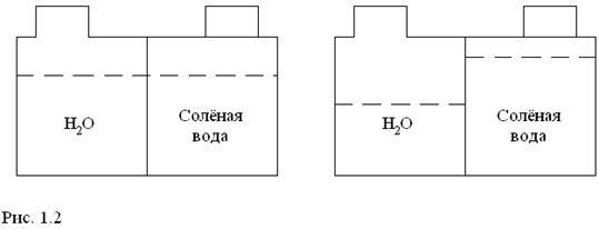Осмос - это самопроизвольная диффузия растворителя из менее концентрированного раствора в более концентрированный раствор через полупроницаемую перегородку. Если чистую воду отделить такой перегородкой от соленой воды, то молекулы воды проникнут в раствор, разбавляя его. Уровень раствора повысится (рис.1.2).