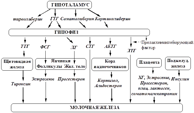 1). Эстрогены. Эстрогенысинтезируются фолликулами яичников и плацентой. Увеличиваются во время беременности, превышают максимум через 33 дня. Стимулируют рост стромы, капилляров, протоков и их ветвлений. Блокируют лактогенную активность пролактина, сокращение миоэпителиальных клеток. Высокая концентрация эстрогенов активирует рост альвеол. 2). Пролактин (ЛТГ). Пролактинсинтезируется лактотрофами передней долей гипофиза, сходен по аминокислотному составу и последовательности аминокислот с СТГ. Синтез контролируется ингибирующим действием пролактинингибирующим фактором, образующимся в средней доли гипофиза. Концентрация в плазме крови: женщин – 8-10 пг/мл, мужчин – 5-8 пг/мл. Пролактин у женщин формирует сексуальное и материнское поведение, у мужчин участвует в сперматогенезе в клетках Лейдига. Стимулирует развитие молочных, сальных желез, рост внутренних органов, секреторную активность молочных желез, желтого тела, стимулирует эритропоэз, утилизацию глюкозы, синтез лактозы и жировой обмен. Количество лактофоров, и синтезированный ими пролактин увеличиваются при беременности. Активность пролактина возрастает в 20 раз. 3).Плацентарный лактоген. Синтезируется синцитиотрофобластом плаценты. Появляется с 6 недели беременности и в течение беременности постоянно растет, достигая максимума к родам. Обладает соматотропным, лактогенным, лютеотропным действием. 4).Прогестерон. Синтезируется в желтом теле и фетоплацентарном комплексе, увеличивается через 3 месяца беременности. Обеспечивает подготовку к лактации: вызывает дифференцировку млечных протоков и альвеол. Тормозит деление клеток (вызванное эстрогенами), образование молока (вызванное пролактином): синтез лактозы, лактоальбумина. Развитию молочной железы также способствуют: СТГ (гипофиз), инсулин (поджелудочная железа), альдостерон, кортизол (кора надпочечников), тиреоидные гормоны (щитовидная железа), хорионический гонадотропин, хорионический соматомаммотропин (плацента). С 4 месяца беременности в эпителиальных клетках ацинусов начинается накопление компонентов молока.