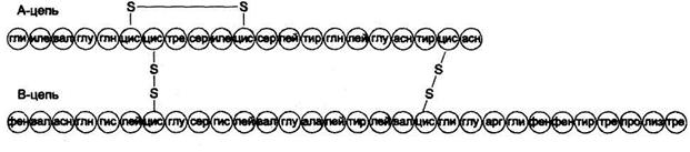 Инсулин — полипептид, состоящий из двух цепей. Цепь А содержит 21 аминокислотный остаток, цепь В — 30 аминокислотных остатков. В инсулине 3 дисульфидных мостика, 2 соединяют цепь А и В, 1 соединяет 6 и 11 остатки в А цепи.