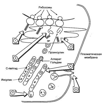 Инсулин может существовать в форме: мономера, димера и гексамера. Гексамерная структура инсулина стабилизируется ионами цинка, который связывается остатками Гис в положении 10 В-цепи всех 6 субъединиц. Инсулины некоторых животных имеют значительное сходство по первичной структуре с инсулином человека. Бычий инсулин отличается от инсулина человека на 3 аминокислоты, а инсулин свиньи отличается только на 1 аминокислоту (ала вместо тре на С конце В-цепи). Во многих положениях А и В цепи встречаются замены, не оказывающие влияния на биологическую активность гормона. В положениях дисульфидных связей, остатков гидрофобных аминокислот в С-концевых участках В-цепи и С- и N-концевых остатков А-цепи замены встречаются очень редко, т.к. эти участки обеспечивают формирование активного центра инсулина. Биосинтез инсулина включает образование двух неактивных предшественников, препроинсулина и проинсулина, которые в результате последовательного протеолиза превращаются в активный гормон. 1. На рибосомах ЭПР синтезируется препроинсулин (L-В-С-А, 110 аминокислот), биосинтез его начинается с образования гидрофобного сигнального пептида L (24 аминокислот), который направляет растущую цепь в просвет ЭПР. 2. В просвет ЭПР препроинсулин превращается в проинсулин при отщеплении эндопептидазой I сигнального пептида. Цистеины в проинсулине окисляются с образованием 3 дисульфидных мостиков, проинсулин становиться «сложным», имеет 5% активности от инсулина. 3. «Сложный» проинсулин (В-С-А, 86 аминокислот) поступает в аппарат Гольджи, где под действием эндопептидазы II расщепляется с образованием инсулина (В-А, 51 аминокислот) и С-пептида (31 аминокислота). 4. Инсулин и С-пептид включаются в секреторные гранулы, где инсулин соединяется с цинком, образуя димеры и гексамеры. В секреторной грануле содержание инсулина и С-пептида составляет 94%, проинсулина, интермедиатов и цинка - 6%. 5. Зрелые гранулы сливаются с плазматической мембраной, а инсулин и С-пептид попадают во внеклеточную жидкость и далее в кровь. В крови олигомеры инсулина распадаются. За сутки в кровь секретируется 40-50 ед. инсулина, это составляет 20% от его общего запаса в поджелудочной железе. Секреция инсулина энергозависимый процесс, происходит с участием микротубулярно-ворсинчатой системы.