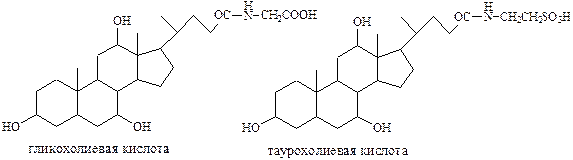 В желчи желчные кислоты присутствуют в основном в виде конъюгатов с глицином (66-80%) и таурином (20-34%), образуя парные желчные кислоты: таурохолевую, гликохолевую и д.р.