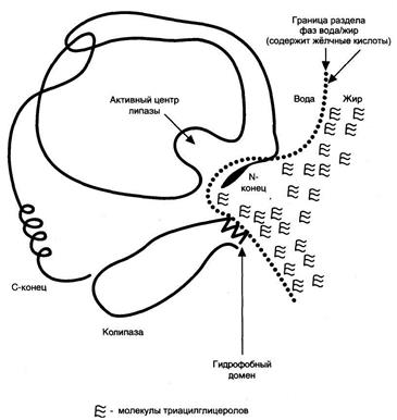 Соли жёлчных кислот, мыла, фосфолипиды, белки и щелочная среда желчи действуют как детергенты (ПАВ), они снижают поверхностное натяжение липидных капель, в результате крупные капли распадаются на множество мелких, т.е. происходит эмульгирование. Эмульгированию также способствует перистальтика кишечника и выделяющийся, при взаимодействии химуса и бикарбонатов СО2: Н+ + НСО3- → Н2СО3 → Н2О + ↑СО2. 2. Гидролизтриглицеридов осуществляет панкреатическая липаза. Ее оптимум рН=8, она гидролизует ТГ преимущественно в положениях 1 и 3, с образованием 2 свободных жирных кислот и 2-моноацилглицерола (2-МГ). 2-МГ является хорошим эмульгатором. 28% 2-МГ под действием изомеразы превращается в 1-МГ. Большая часть 1-МГ гидролизуется панкреатической липазой до глицерина и жирной кислоты. В поджелудочной железе панкреатическая липаза синтезируется вместе с белком колипазой. Колипаза образуется в неактивном виде и в кишечнике активируется трипсином путем частичного протеолиза. Колипаза своим гидрофобным доменом связывается с поверхностью липидной капли, а гидрофильным способствует максимальному приближению активного центра панкреатической липазы к ТГ, что ускоряет их гидролиз.