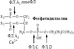 3. Гидролизлецитина происходит с участием фосфолипаз (ФЛ): А1, А2, С, D и лизофосфолипазы (лизоФЛ).