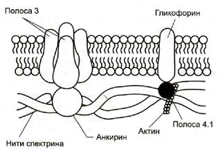 Эритроциты у человека и млекопитающих в токе крови обычно (80%) имеют форму двояковогнутых дисков и называются дискоцитами. Такая форма эритроцитов создаёт наибольшую площадь поверхности по отношению к объёму, что обеспечивает максимальный газообмен, а также обеспечивает большую пластичность при прохождении эритроцитами мелких капилляров. Диаметр эритроцитов у человека колеблется от 7,1 до 7,9 мкм, толщина эритроцитов в краевой зоне - 1,9 - 2,5 мкм, в центре - 1 мкм. В нормальной крови указанные размеры имеют 75% всех эритроцитов - нормоциты; большие размеры (свыше 8,0 мкм) - 12,5 % - макроциты. У остальных эритроцитов диаметр может быть 6 мкм и меньше - микроциты. Поверхность отдельного эритроцита у человека приблизительно равна 125 мкм2, а объём (MCV) – 75-96 мкм3. Эритроциты человека и млекопитающих представляют собой безъядерные клетки, утратившие в процессе фило- и онтогенеза ядро и большинство органелл, они имеют только цитоплазму и плазмолемму (клеточную мембрану), толщиной около 20 нм. Химический состав эритроцитов Плазмолемма эритроцитов Плазмолемма эритроцитов состоит из примерно равного количества липидов и белков, а также небольшого количества углеводов. Липиды Бислой плазмолеммы образован глицерофосфолипидами, сфингофосфолипидами, гликолипидами и холестерином. Внешний слой содержит много фосфатидилхолина, сфингомиелина и около 5% (от общего количества липидов) гликолипидов, внутренний - много фосфатидилсерина и фосфатидилэтаноламина. Белки В плазмолемме эритроцита идентифицировано 15 главных белков с молекулярной массой 15-250 кДа. Большинство этих белков (спектрин, гликофорин, белок полосы 3, белок полосы 4.1, актин, анкирин) образуют с цитоплазматической стороны плазмалеммы цитоскелет, который придает эритроциту двояковогнутую форму и высокую механическую прочность.