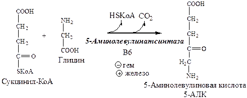 Гем синтезируется во всех тканях, но с наибольшей скоростью в костном мозге и печени. В костном мозге гем необходим для синтеза гемоглобина, в гепатоцитах — для образования цитохрома Р450. 1). Аминолевулинат-синтаза, пиридоксальзависимый фермент, в матриксе митохондрий катализирует образование 5-аминолевулиновой кислоты (5-АЛК) из глицина и суцинил-КоА. Суцинил-КоА поступает из ЦТК. Реакцию ингибирует и репрессирует гем. В ретикулоцитах реакцию индуцирует железо (через железосвязывающий белок и железочувствительный элемент (IRE)). Дефицит пиридоксальфосфата снижает активность аминолевулинатсинтазы. Стероидные гормоны и некоторые лекарства (барбитураты, диклофенак, сульфаниламиды), инсектициды, канцерогенные вещества являются индукторами аминолевулинатсинтазы. Это связано с возрастанием потребления гема системой цитохрома Р450, который участвует в метаболизме этих соединений в печени.