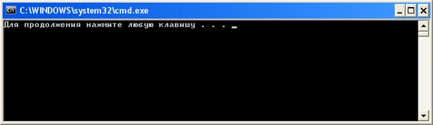 Рис. 7 Консоль выполнения программы После просмотра консоли закройте ее, нажав на крестик. Теперь можно составить простейшую программу, которая напишет на экране фразу «PRIVET, STUDENT!!!». В код нашей заготовки нужно добавить несколько строк: #include <iostream> // т.к. нужно будет использовать оператор вывода на экран cout using namespace std; // подключение пространства имен cout<<”PRIVET, STUDENT!!!”<<endl; // вывод фразу на экран и перевод курсора на новую строку, чтобы стандартная фраза «Для продолжения нажмите любую клавишу…» не «налипла» на нашу фразу. Итак, итоговый код программы представлен на рисунке 8.