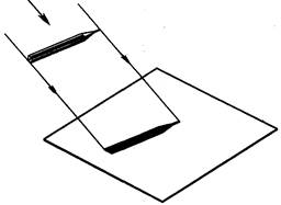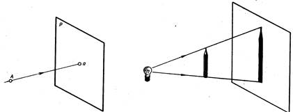 Форму любого предмета можно рассматривать как сочетание отдельных простейших геометрических тел. А для изображения геометрических тел нужно уметь изображать их отдельные элементы: вершины (точки), ребра (прямые), грани (плоскости). В основе построения изображений лежит способ проецирования. Получить изображение какого-либо предмета — значит спроецировать его на плоскость чертежа, т.е. спроецировать отдельные его элементы. Поскольку простейшим элементом любой фигуры является точка, изучение проецирования начинают с проецирования точки. Для получения изображения точки А на плоскости Р (рис. 4.1) через точку А проводят проецирующий луч Аа. Точка пересечения проецирующего луча с плоскостью Р будет изображением точки А на плоскости Р (точка а), т. е. ее проекцией на плоскость Р. Такой процесс получения изображения (проекции) называют проецированием. Плоскость Р является плоскостью проекций. На ней получают изображение (проекцию) предмета, в данном случае точки. Принцип проецирования легко понять на примере получения тени предмета на стене или листе бумаги. На рис. 4.1 изображена тень карандаша, освещенного лампой, а на рис. 4.2 — тень карандаша, освещенного солнечным светом. Если представить световые лучи прямыми линиями, то есть проецирующими лучами, а тень — проекцией (изображением) предмета на плоскости, то легко представить себе механизм проецирования.