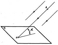 Рис. 4.3 Изображения, получаемые способом центрального проецирования, подобны изображениям на сетчатке нашего глаза. Они наглядны, понятны для нас, так как показывают нам предметы окружающей действительности такими, какими мы их привыкли видеть. Но искажение размеров предметов и сложность построения изображений при центральном проецировании не позволяют использовать его для изготовления чертежей. Центральные проекции широко применяют лишь там, где нужна наглядность в изображениях, например, в архитектурно-строительных чертежах при изображении перспектив зданий, улиц, площадей и т. п. Параллельное проецирование. Если центр проецирования — точку S удалить в бесконечность, то проецирующие лучи станут параллельными друг другу. На рис. 4.4 показано получение параллельных проекций точек А и В на плоскости Р. В зависимости от направления проецирующих лучей по отношению к плоскости проекций параллельные проекции делятся на косоугольные и прямоугольные. При косоугольном проецировании угол наклона проецирующих лучей к плоскости проекций не равен 90о (рис. 4.5). При прямоугольном проецировании проецирующие лучи перпендикулярны плоскости проекций (рис. 4.6). Рассмотренные выше способы проецирования не устанавливают взаимно однозначного соответствия между объектом (точка А) и его изображением (проекцией). При заданном направлении проецирующих лучей на плоскости проекций всегда получается лишь одна проекция точки, но судить о положении точки в пространстве по одной ее проекции невозможно, так как на одном и том же проецирующем луче Аа (рис. 4.7) точка может занимать различные положения, находясь выше или ниже заданной точки А, и какое положение точки в пространстве соответствует изображению (проекции) а, определить невозможно.