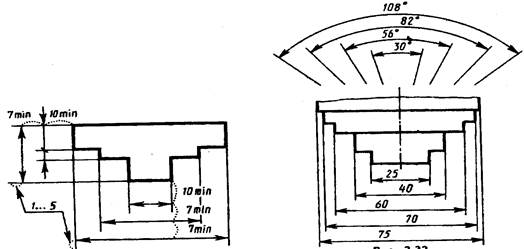 Рис. 6.1 Минимальные расстояния между параллельными размерными линиями — 7 мм, а между размерной и линией контура — 10 мм (рис. 6.2). Необходимо избегать пересечения размерных и выносных линий, располагая их так, как показано на рис. 6.3. Выносные линии должны выходить за концы стрелок или засечек на 1...5 мм (см. рис. 6.2). Размерные числа наносят над размерной линией возможно ближе к ее середине. При нанесении размера диаметра внутри окружности размерные числа смещают относительно середины размерных линий. Над параллельными или концентричными размерными линиями размерные числа располагают в шахматном порядке (рис. 6.3).