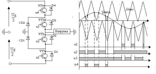 Идею построения и управления многоуровневым инвертором рассмотрим на примере одного плеча трехфазного инвертора, изображенного на рис.2.32.а. Такой инвертор запитывается от источника со средней точкой. Роль делителя напряжения обычно выполняют электролитические конденсаторы. Одно плечо инвертора содержит четыре последовательно включенных транзистора с обратными диодами. Схема дополняется двумя фиксирующими диодами (Clamped diode CD1, CD2). Способ управления транзисторами инвертора поясняет рис.2.32.б Схема управления строится аналогично рассмотренной ранее схеме управления мостовым ШИП с поочередным алгоритмом управления. При положительной полуволне модулирующего напряжения транзистор VT3 включен, транзистор VT1 выключен, а транзисторы VT2, VT4 переключаются в моменты равенства модулирующего (синусоидального) и пилообразного напряжения несущей частоты. При отрицательной полуволне модулирующего напряжения переключаются транзисторы VT1, VT3, транзистор VT2 включен, а транзистор VT4 выключен. Аналогично, но со сдвигом модулирующего напряжения на 120 градусов, управляются два других плеча трехфазного инвертора. Линейное выходное напряжение трехфазного инвертора и его спектр при