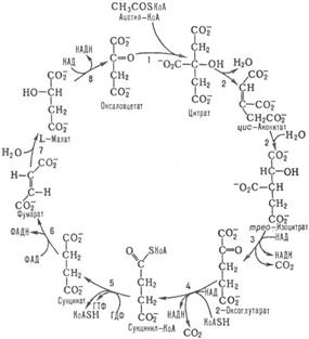 6.Цикл трикарбоновых кислот. Цикл трикарбоновых кислот (цикл Кребса, цитратный цикл) — центральная часть общего пути катаболизма, циклический биохимический аэробный процесс, в ходе которого происходит превращение двух- и трёхуглеродных соединений, образующихся как промежуточные продукты в живых организмах при распаде углеводов, жиров и белков, до CO2. При этом освобождённый водород направляется в цепь тканевого дыхания, где в дальнейшем окисляется до воды, принимая непосредственное участие в синтезе универсального источника энергии — АТФ.Цикл Кребса — это ключевой этап дыхания всех клеток, использующих кислород, центр пересечения множества метаболических путей в организме. Кроме значительной энергетической роли циклу отводится также и существенная пластическая функция, то есть это важный источник молекул-предшественников, из которых в ходе других биохимических превращений синтезируются такие важные для жизнедеятельности клетки соединения как аминокислоты, углеводы, жирные кислоты и др.Цикл превращения лимонной кислоты в живых клетках был открыт и изучен немецким биохимиком Хансом Кребсом, за эту свою работу он (совместно с Ф. Липманом) был удостоен Нобелевской премии (1953 год).У эукариот все реакции цикла Кребса протекают внутри митохондрий, причём катализирующие их ферменты, кроме одного, находятся в свободном состоянии в митохондриальном матриксе, исключение составляет сукцинатдегидрогеназа, которая локализуется на внутренней митохондриальной мембране, встраиваясь в липидный бислой. У прокариот реакции цикла протекают в цитоплазме.При работе цикла Кребса окисляются различные продукты обмена, в частности токсичные недоокисленные продукты распада алкоголя, поэтому стимуляцию цикла Кребса можно рассматривать как меру биохимической детоксикации.