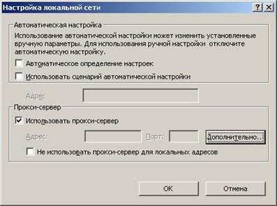Далі настроювання розрізняються, залежно від способу доступу до Мережі. У випадку доступу по локальній мережі або через будь-який вид з'єднання, що викорисовує звичайний мережний адаптер, необхідно нажати на кнопку «Настроювання мережі». У вікні, що з'явиться на екрані, встановіть прапорець Використовувати проксі-сервер. Стануть доступні для введення даних два поля (рис.3). Присвойте полю Адреса значення IP-адреси проксі-сервера, а полю Порт – значення номера порту.