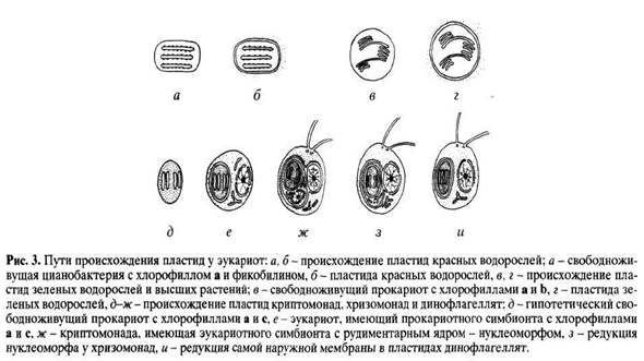 Зеленые водоросли, мхи и сосудистые растения также имеют пластиды, организация которых говорит об их прокариотном происхождении. Они окружены двумя мембранами, но содержат другой набор пигментов, а именно: хлорофиллы а и b. Это дает основание предполагать, что пластиды зеленых водорослей не родственны цианобактериям, а произошли от другой группы фотосинтезирующих оксибактерий, обладающих хлорофиллами а и b (рис. 3, в, г). И действительно, в современной биосфере найдены прокариотные организмы, обладающие хлорофиллами а и b и тилакоидами, собранными в ламеллы. Это представители особой группы сравнительно недавно обнаруженных оксифотобактерий Prochlorophytes (Lewin, 1976, 1977, 1984; Whatley, 1977; Burger-Wiersma et al., 1986; Chisholm et al., 1988). В современной биосфере они занимают довольно скромное место, хотя разнообразие жизненных форм этих бактерий (это и обитатели туники сложных асцидий, и свободноживущие планктонные формы, и нитчатые бактерии) говорит о том, что прохлорофиты в прошлом могли играть роль, не менее важную, чем цианобактерии. Возможно, что прохлорофиты могли участвовать в образовании строматолитов (Reimer et al., 1979). Современные прохлорофиты не являются предками пластид зеленых водорослей (об этом говорят, в частности, данные анализа нуклеотидной последовательности генов рибосомальных РНК (Seewaldt, Stackebrandt, 1982); скорее всего, и те и другие имели отдаленного общего предка. Пластиды золотистых водорослей (Chrysophyta), желто-зеленых водорослей (Xanthophyta), бурых и диатомовых водорослей устроены морфологически сложнее, чем пластиды красных и зеленых водорослей. Они окружены четырьмя мембранами и содержат другой набор хлорофиллов, а именно: a, cl и с2. Происхождение таких пластид было непонятно до тех пор, пока не были исследованы пластиды криптофитовых водорослей (Cryptophyta). Последние имеют тот же набор хлорофиллов и четырехмембранную оболочку. Своеобразие пластид криптофитовых состоит в том, что в пространстве между второй и третьей мембранами у них обнаружено маленькое эукариотное ядро (так называемый "нуклеоморф") и цистерны эндоплазматического ретикулюма (Gillot, Gibbs, 1980; Cavalier-Smith, 1981; Gibbs, 1981). Это позволяет предполагать, что предками пластид криптофитовых были эукариотные организмы, которые сами в свое время приобрели прокариотных симбионтов. Таким образом, клетка криптофитовой водоросли является сложной конструкцией: она содержит эукариотного симбионта, внутри которого находится прокариотный симбионт. Наружная мембрана пластиды это мембрана вакуоли хозяина, вторая мембрана это поверхностная мембрана эукариотного симбионта, третья мембрана это мембрана вакуоли эукариотного симбионта, а четвертая это мембрана прокариотного симбионта. Следовательно, сначала какой-то хищный протист приобрел прокариотного симбионта - фотосинтезирующую бактерию с хлорофиллами a, cl и с2, а потом сам этот протист стал симбионтом другого эукариотного жгутиконосца (рис. 3, д-ж). Пластиды Xanthophyta, Phaeophyta и Bacillariophyta утратили нуклеоморф, хотя и сохранили сложную четырехмембранную оболочку. Редукция нуклеоморфа означает увеличение интеграции симбиотической системы, в процессе которой большинство генов симбионта переходит в ядро хозяина. Следующий шаг - постепенное уменьшение числа мембран симбионта. Так, у динофитовых водорослей (Dinophyta) пластиды (содержащие хлорофиллы а и с2) окружены тремя мем