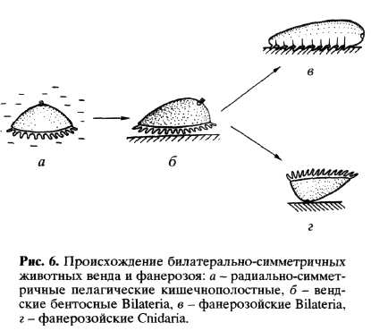 Первичные Metazoa, вероятно, были однослойными шарообразными организмами, медленно плавающими в толще воды (рис. 5, б). Организацию таких предковых форм рекапитулируют бластулообразные личинки многоклеточных животных (рис. 5, в). Однослойные докембрийские Metazoa, перейдя к прикрепленному образу жизни, дали большое разнообразие форм в позднем докембрии (Бурзин, 1999). Возможно, некоторые трудно интерпретируемые организмы венда представляют собой результат морфологического усложнения тонкостенных потомков бластулообразных предков Metazoa. От них же, по-видимому, происходят губки и губкообразные организмы (археоциаты) фанерозоя. В отличие от тонкостенных организмов докембрия у губок усиленному развитию подвергся мезохил - промежуточное вещество бластоцеля, в котором возникли скелетные элементы и который постепенно заселился клетками различных типов. По типу захвата пищевых частиц губки (как, вероятно, и тонкостенные организмы венда) не отличаются от одноклеточных протестов: пищевые частицы (бактерии) захватываются каждой воротничковой клеткой индивидуально и перевариваются в пищеварительных вакуолях. Поэтому и вся эволюция примитивных многоклеточных оказывается направленной на увеличение поверхности слоя воротничковых клеток, через который происходит захват пищевых частиц. У губок - это формирование многочисленных жгутиковых камер в толще мезохила, общая площадь которых превосходит наружную поверхность во много раз, а у тонкостенных вендских форм - формирование складок и камер, выстланных питающим эпителием. Настоящие многоклеточные (Eumetazoa) - это формы, имеющие орган захвата пищи - рот, орган переваривания пищи - кишечную полость, нервную систему и мускулатуру. Рот, кишечник, нервная система и мускулатура появляются в эволюции как бы "одновременно". Не существует животных со ртом и кишечником, но без мускулатуры и нервной системы или организмов с нервной системой, но без мускулатуры, рта и кишечника и т.п. Вероятно, это означает, что само появление кишечной полости было связано с питанием относительно крупной добычей, для овладения которой требовались координированные мышечные сокращения и нервная система. Первыми организмами, обладающими нервной системой, мускулатурой, ртом и кишечником, были вендские кишечнополостные. Вендские Coelenterata это кишечнополостные в широком смысле, т.е. двуслойные организмы с кишечником, связанным с внешней средой только ротовым отверстием. Среди них были и радиально-симметричные и билатерально-симметричные формы. Нет доказательств, что вендские кишечнополостные обладали специализированными стрекательными клетками или гребными пластинками, т.е. нет оснований относить их к типам Cnidaria или Ctenophora. Скорее всего, стрекающие кишечнополостные и гребневики появились уже в фанерозое, хотя их предками были вендские кишечнополостные. Как известно, в отложениях венда имеются и первые билатерально-симметричные формы (Dickinsonia, Vendia, Onega и др., см. Соколов, 1976,1997; Федонкин, 1981,1983,1984). Таким образом, происхождение первых билатерально-симметричных форм следует отнести еще к позднему докембрию (приблизительно 600 млн. лет назад). Морфология вендских Bilateria свидетельствует о том, что первые билатерально-симметричные животные были метамерными организмами. Эта метамерия есть результат трансформации цикломерии кишечн