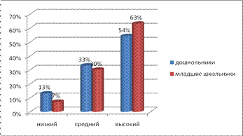 Как и дошкольники, так и младшие школьники с задержкой психического развития в большинстве случаев справились с предложенными заданиями экспресс - диагностики. Единичные отказы были связаны с выраженной утомляемостью детей. Трудно дифференцированными для детей дошкольного возраста оказались эмоции: удивление и испуг. Затруднения с идентификацией этих эмоций возникли и у младших школьников, но в меньшей мере. Как показал эксперимент, дети обоих возрастов лучше распознают базовые эмоции на фото - изображениях. При определении эмоционального состояния на сюжетных картинках некоторым дошкольникам с задержкой психического развития потребовалась стимулирующая помощь взрослого, различные наводящие вопросы. Дети младшего школьного возраста справились с поставленной задачей, лишь некоторые отказывались от выполнения задания, сопровождая отказ словами «не знаю», ввиду утомляемости. Задание с подбором идентичных эмоций показало, что дошкольники в ряде случаев сопоставляли парные эмоции не внимательно, не придавая значения чертам лица, изображённых на картинках. У младших школьников данное задание не вызвало особых трудностей. При подборе пиктограммы к сюжетной картинке дошкольникам с задержкой психического развития чаще всего требовалась помощь взрослого, дети невнимательны. Младшие школьники так же в ряде случаев затруднялись при выполнении, но так же часть ребят успешно справились с задачей, аргументировали свой выбор. Успешнее дети обоих возрастных групп подобрали пиктограмму к портретному изображению. Из процедуры наблюдения видно, что дети младшего школьного возраста с задержкой психического развития успешнее распознают эмоциональные состояния окружающих, но не всегда критичны к себе и к своим действиям. В коммуникативном общении между собой дружелюбны, преобладают положительные эмоции, на занятиях дошкольники легко отвлекаются, их деятельность трудно организовать. Младшие дошкольники также легко отвлекаемы на уроке, скованы в ответах. У детей данной категории имеются затруднения в интерпретации невербального поведения, что свидетельствует о недостаточности знаний и представлений о психических состояниях людей, выражаемых с помощью невербальных знаков, о слабой направленности сознания на познания внутреннего мира личности и особенностей ее эмоциональной сферы. Подводя итоги, относительно дошкольников и младших школьников с умственной отсталостью можно сказать о том, что в обеих возрастных группах преобладает низкий уровень сформированности представлений об эмоциональных состояниях. Меньше половины всех испытуемых имеют средний уровень. Возрастные различия можно проследить в диаграмме (рис.8):