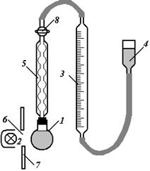 Установка складається з кварцової колби 1, яка пропускає ультрафіолетові промені, зворотнього холодильника 5, градуйованої газової бюретки 3, зрівнювальної склянки 4 та ртутнокварцевої лампи 2. Кварцеву колбу 1 з розчином Н2О2 зєднати із зворотним холодильником 5 і встановити проти отвору 6 і захисного щитка 7. Відкрити кран 8 і рівень рідини в бюретці 3 при допомозі зрівнювальної склянки 4 поставити на нуль. Пустити воду в холодильник і дочекати моменту, коли встановиться рівень рідини в газовій бюретці при закритому крані 8. Рівень рідини, що змінився в бюретці, встановити відкриттям крану 8. Цим досягається сталість тиску, що рівний атмосферному. Після вирівнювання рівней при закритому крані 8 включається одночасно ртутнокварцева лампа і секундомір. Перший підрахунок записати після того, коли виділяться 1,0 -1,5 см3 кисню, потім через 3 хв., коли швидкість виділення газу досягне 1 см3/хв., підрахунки вести через хвилину. При підрахунку об’єму газу Дослід припинити, коли виділиться 75-100 см3 газу. Дослідні дані записати в таблицю: