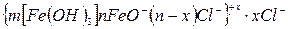 На поверхні колоїдної частинки із розчину адсорбуються ті йони, які за своєю природою близькі до складу ядра. Тоді будову колоїдної частинки золю гідроксиду феруму (ІІІ) схематично можна зобразити так: