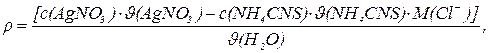 де r(Cl–) – масова концентрація хлор-йона, мг/л; M(Cl–) – молярна маса йонів хлору, мг/моль; J(H2O) – об’єм досліджуваної води, л; с(AgNO3) – молярна концентрація розчину AgNO3, моль/л; с(NH4CNS) – молярна концентрація розчину NH4CNS, моль/л; J(AgNO3) – об’єм титрованого розчину AgNO3, л; J(NH4CNS) – об’єм титрованого розчину NH4CNS, л.