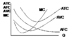 Рис. 4.2. Средние и предельные издержки 2. Средние переменные издержки (AVC - average variable cost) – это переменные издержки в расчете на одну единицу продукции. Рассчитываются как деление переменных издержек на объем произведенной продукции: AVC = Изменение AVC определяется законом убывающей предельной отдачи. При малом объеме производства производственный процесс будет относительно неэффективным, поскольку переменные ресурсы будут использоваться в недостаточном количестве и имеющееся оборудование окажется недогруженным. Соответственно переменные издержки в расчете на единицу продукции AVC окажутся высокими. Однако по мере расширения производства и увеличения переменного ресурса эффективность использования оборудования возрастает, предельная отдача от каждой дополнительной единицы переменного ресурса увеличивается, в результате переменные издержки в расчете на единицу продукции AVC будут снижаться. Вследствие применения все большего и большего количества переменных ресурсов при неизменном количестве оборудования с какого-то момента отдача от каждой дополнительной единицы переменного ресурса снижается. Следовательно, переменные издержки в расчете на единицу продукции будут расти. График AVC выглядит вначале как нисходящая линия, достигает минимума при некотором объеме производства и затем представляет восходящую линию (Рис. 4.2). 3. Средние общие издержки (ATC (AC)- average total cost) – это общие издержки в расчете на единицу продукции. Определяются как деление общих издержек на объем произведенной продукции: AC = Средние общие издержки можно определить как сумму средних переменных и средних постоянных издержек: AC = AVC + AFC. Поэтому на изменение AC при увеличении производства оказывает влияние два фактора - изменение средних переменных издержек AVC и средних постоянных издержек AFC (Рис.4.2). На первом участке средние общие издержки AC снижаются, так как снижаются и средние переменные издержки (AVC) и средние постоянные издержки (AFC). Но с некоторого момента AC увеличиваются, так как увеличиваются переменные издержки (AVC). Снижение AFC на этом участке будет незначительным, поскольку они уже достигли низкого уровня, и почти не будут оказывать влияния на величину средних общих издержек, поэтому средние издержки AC будут изменяться практически только под воздействием роста средних переменных издержек AVC. Поскольку AFC стремится к нулю, то при больших объемах производства AC сближаются с AVC (Рис.4.2). Графически при любом объеме производства величина AC – это высота от горизонтальной оси до точки на графике AC, состоящая из двух отрезков AVC и AFC. При этом AFC представляют собой расстояние между графиками AC и AVC, которое уменьшается при увеличении объема производства в связи с уменьшением AFC. Минимальное значение AC достигается при большем объеме производства, чем минимум AVC. Это объясняется тем, что когда AVC начинают повышаться, AC еще некоторое время снижается за счет более существенного снижения AFC. Далее значительного снижения AFC не происходит, так как они стремятся к нулю, поэтому начинается рост AC практически только под влиянием возрастающих средних переменных издержек AVC. Фирма рассчитывает величину средних издержек, чтобы сопоставить со средним доходом (то есть ценой Р), так она определяет прибыль или убытки в расчете на единицу продукции Р - AC. Умножая получен