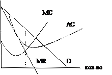 Государственное регулирование монополии, направленное на достижения общественно эффективного распределения ресурсов, предполагает установление цены на уровне предельных издержек Р(=6дол) = MC. Однако эта цена может быть столь низкой, что фирма станет убыточной. Тогда государство должно разрабатывать политику по преодолению убытков, в частности может установить т.н. «справедливую цену», равную средним издержкам, чтобы фирма могла полностью возместить издержки. «Справедливая цена» может быть несколько выше, чем предельные издержки, а значит, не будет достигнуто эффективное распределение ресурсов. В этом случае возникает дилемма регулирования: общественно справедливая цена обеспечивает безубыточную деятельность монополии, но при этом не выполняется задача эффективного распределения ресурсов. Задание 2. По графику определите, на каком рынке работает фирма: