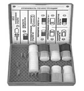 Рисунок 6. Аптечка АИ-2 Радиозащитное средство № 1, гнездо №4, два пенала малинового цвета. Необходимо принимать при угрозе облучения 6 таблеток, запивая водой. При новой угрозе облучения через 4-5 часов принять еще 6 таблеток. Детям до 8 лет на 1 прием дают 1,5 таблетки, а от 8 до 15 лет - 3 таблетки. Противорвотное средство, гнездо №7, пенал голубого цвета. Необходимо принимать 1 таблетку сразу после облучения, а также, если появилась тошнота после ушиба головы. Детям до 8 лет на 1 прием дают 1/4 таблетки, а от 8 до 15 лет - 1/2таблетки. Противобактериальное средство №1, гнездо №5, два пенала без окраски с квадратными корпусами. Необходимо принимать при угрозе или бактериальном заражении, а также при ранах и ожогах содержимое одного пенала (5 таблеток), запивая водой. Содержимое второго пенала (5 таблеток) принимать через 6 часов. Детям до 8 лет на 1 прием дают 1 таблетку, а от 8 до 15 лет - 2,5 таблетки. Радиозащитное средство №2, гнездо №6, пенал белого цвета. Необходимо принимать взрослым и детям по 1 таблетке ежедневно в течение 10 дней после выпадения радиоактивных осадков, вместе с молоком. Противобактериальное средство №2, гнездо №3, большой пенал без окраски. Необходимо принимать после облучения при возникновении кишечно-желудочных расстройств по 7 таблеток в один прием в первые сутки, по 4 таблетки в последующие двое суток. Детям до 8 лет принимают в первые сутки на 1 прием - 2 таблетки, а от 8 до 15 лет - 3,5 таблетки. В последующие 2 суток детям до 8 лет дают 1 таблетку на прием, а от 8 до 15 лет - 3 таблетки. Средство про отравлении ФОВ, гнездо №2, пенал красного цвета. Необходимо принимать по 1 таблетке по сигналу гражданской обороны. При увеличении признаков отравления надо принять еще одну таблетку. Детям до 8 лет на 1 прием дают 1/4 таблетки, а от 8 до 15 лет - 1/2 таблетки. Средства при отравлении ФОВ и противоболевое вкладываются потребителем. Гарантийный срок хранения - 3 года. Аптечка индивидуальная АИ-2 предназначена для оснащения каждого работника всех объектов экономики Российской Федерации вне зависимости от формы собственности. Аптечка индивидуальная АИ-2 входит в обязательный табель оснащения нештатных аварийно спасательных формирований (НАСФ), которые входят в состав сил и средств Гражданской обороны и Гражданской защиты особоопасных предприятий, которые имеют важное оборонное и экономическое значение в соответствии с приказом МЧС РФ № 999 от 23.12.2005 г. ГОСТ 23267-78