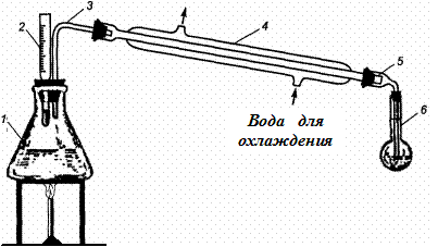Рисунок 13 – Установка для отгонки этанола при атмосферном давлении: 1 – перегонная колба; 2 – термометр; 3 – отводная трубка; 4 – холодильник; 5 – алонж; 6 – приемная колба.