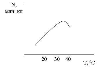 Характерные зависимости числа клеток N от температуры и рН среды представлены на рисунках 16 и 17 соответственно. Рисунок 16 – Зависимость числа клеток от температуры в процессе культивирования кормовых дрожжей Превышение температуры в биореакторе на 1-2 0С относительно оптимальной (37 0С) приводит к заметному снижению числа клеток вследствие их гибели (рис. 16). Снижение температуры ниже 30 0С также сопровождается снижением числа клеток из-за угнетения их деятельности. Поэтому очевидна необходимость автоматизации технологического процесса для поддержания температуры в области значений от 30 до 37 0С. Оптимальное значение рН среды для культивирования дрожжей находится в области нейтральных значений. Процесс культивирования дрожжевых клеток в условиях неоптимальных значений рН среды является вынужденным производственным приемом и осуществляется для поддержания чистоты дрожжевой культуры в нестерильных условиях (рис. 17). Проведение процесса культивирования дрожжей при рН 4,5-4,8 обеспечивает их преимущественное развитие по сравнению с контаминирующими бактериями. При нейтральных рН среды развитие бактерий-контаминантов на нестерильной питательной среде вследствие более высоких скоростей роста и размножения подавляет развитие дрожжей-продуцентов.