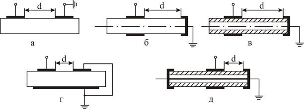 Рис. 2.1. Іскрові проміжки для дослідження нормальної (а,б,в) та тангенційної (г,д) складової перекриття по поверхні твердого діелектрика